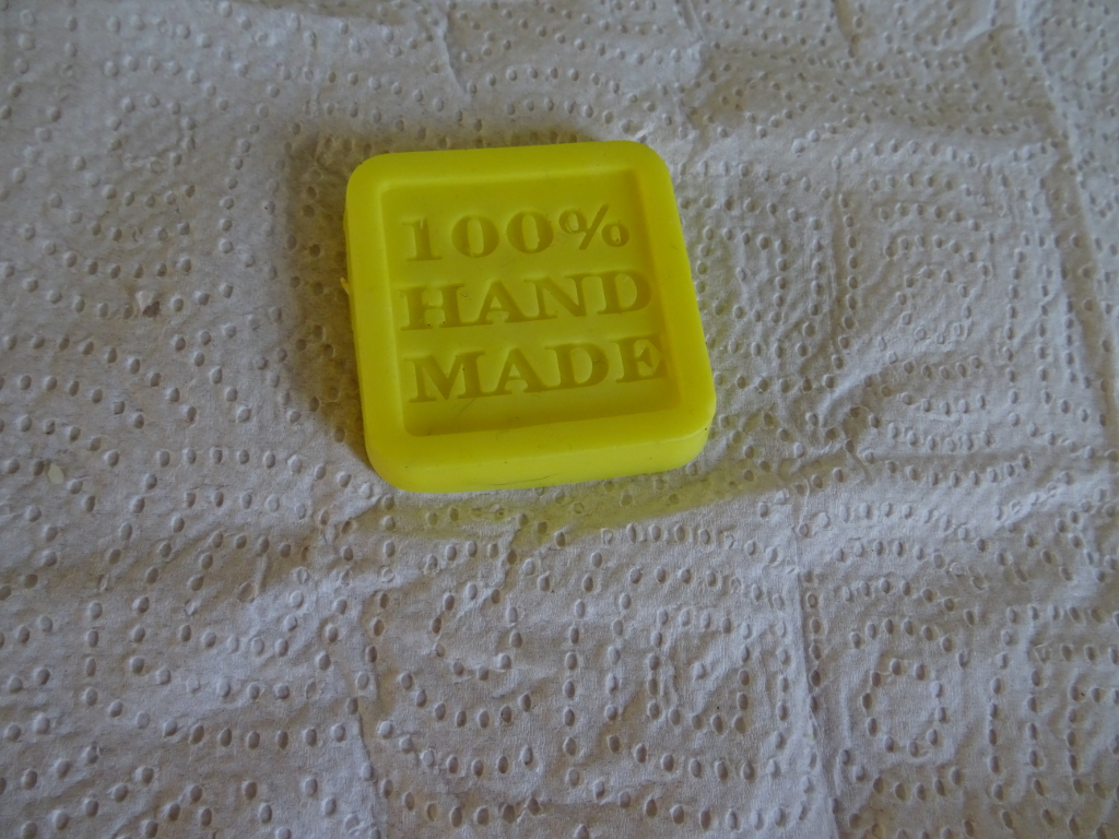 First, I cut the soap base into small cubes. Guessing how much soap I’d need, didn’t turn out to be as difficult as I’d expected. Then I melted the soap base in the microwave. This is not ideal, as the heat may not be evenly distributed through the soap, but I didn’t want to add complexity by melting my soap base in a double boiler. It worked fine for me. Once the soap was melted (which takes only about 30 seconds in the microwave), I added in a few drops of colorant and fragrance oil. The colorant and fragrance oil bottles I used have a dropper, but I just guessed how much I’d need, as you can never be sure the dropper works properly. Then I stirred quickly and poured the soap into the mold. You only have a few minutes from taking the soap out of the microwave to pouring it into the mold. If you see or suspect bubbles in your soap, you can spray alcohol over them, but I didn’t do that this time, as I cannot actually see where the soap bubbles are. I then left my soap to harden for about 45 minutes. It turned out pretty good.