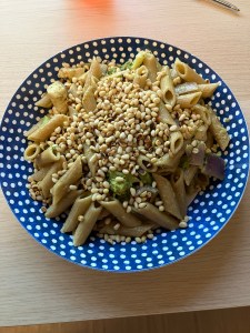 First, on March 5, I cooked pasta with pesto, chicken and broccoli. My spouse joked after seeing the picture that the pine nuts were on sale. In reality, I hadn’t originally planned to sprinkle the pasta with pine nuts but my staff had loads of them, originally intended for her parrots, who don’t even really like them or that’s what she said.