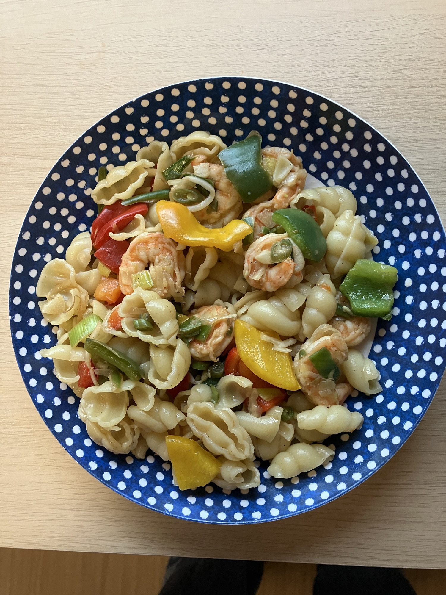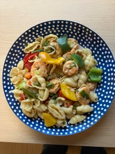 A little over a week later, I cooked pasta again. This time, I included shrimp, lots of garlic, peppers, a few packages of mixed veg and, because according to me this was too little for ten people, a few bell peppers too. I needn’t have worried, because everyone had enough to eat and there were still a few servings left to go in the freezer.