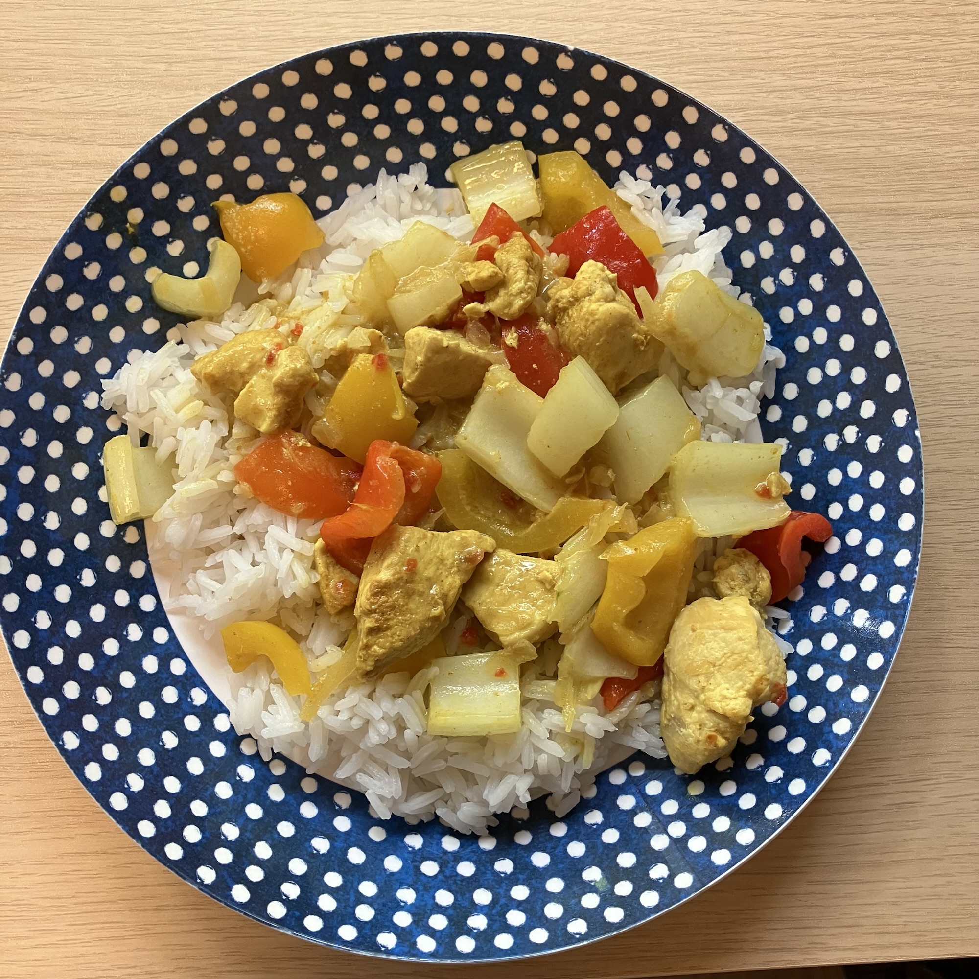 A staff who is on sick leave and occasionally pops round as an extra, offered to help me cook a meal for my side of the home the next Tuesday. I cooked curried rice with chicken, bell peppers and bok choy. I hadn’t had bok choy since childhood and incorrectly assumed its green leaves can’t be eaten. The meal doesn’t look as thin as I believe a curry should be, but it was delicious.