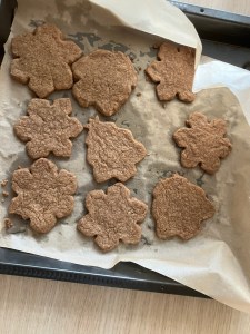 Over the rest of the month, like I said, I didn’t cook dinner. However, I did do several baking activities. This started on December 5 with a spontaneous attempt at baking St. Nicholas cookies. St. Nicholas is celebrated here on December 5, although we’d celebrated it at my home a few weeks earlier. I had gotten a package of cookie mixture with St. Nick and Pete (his servant) cookie cutters. Unfortunately, my staff and I had forgotten to get the butter for the dough at room temperature. We decided to add some melted butter to make the dough stickier, but that made it too sticky for the detailed cutters to work. We decided to go for Christmas-themed cutters, which were less detailed, then.
