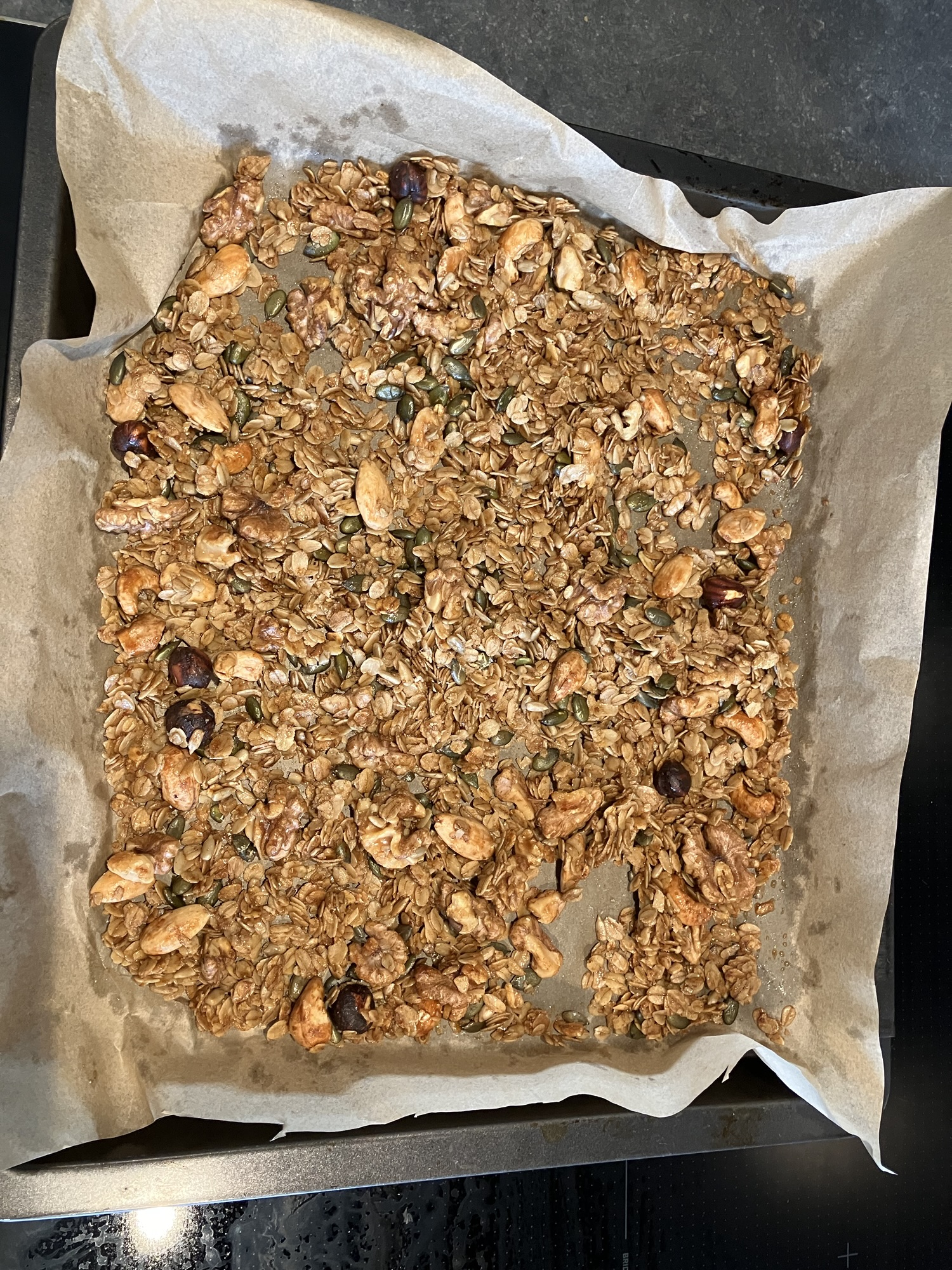 I also didn’t cook a main dish even once. That’s sad, but on the other hand, I did manage to bake a few things. Most recently, yesterday, I baked granola. I ate it this morning with my quark and it was delicious!