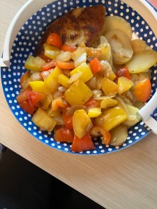 The other was baked potatoes, onion, bell peppers and a veggie schnitzel (which the EU has decided soon can’t be called schnitzel anymore due to it not containing animal, despite no-one knowing where a cow’s schnitzel is located on its body).