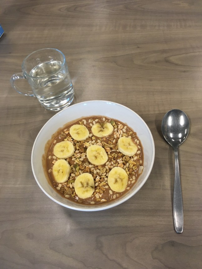 Today was even better. On Wednesdays, the staff interns at day activities usually do a cooking activity with me, as most other clients are off to a weekly music performance in the assembly hall. I hate the music performance but love cooking, so that’s a win-win. One of the interns changed her schedule, so isn’t on on Wednesday anymore, but the other still is. Today, we made a smoothie bowl. It didn’t turn out as well as I wanted. Particularly, we used a little too much milk.