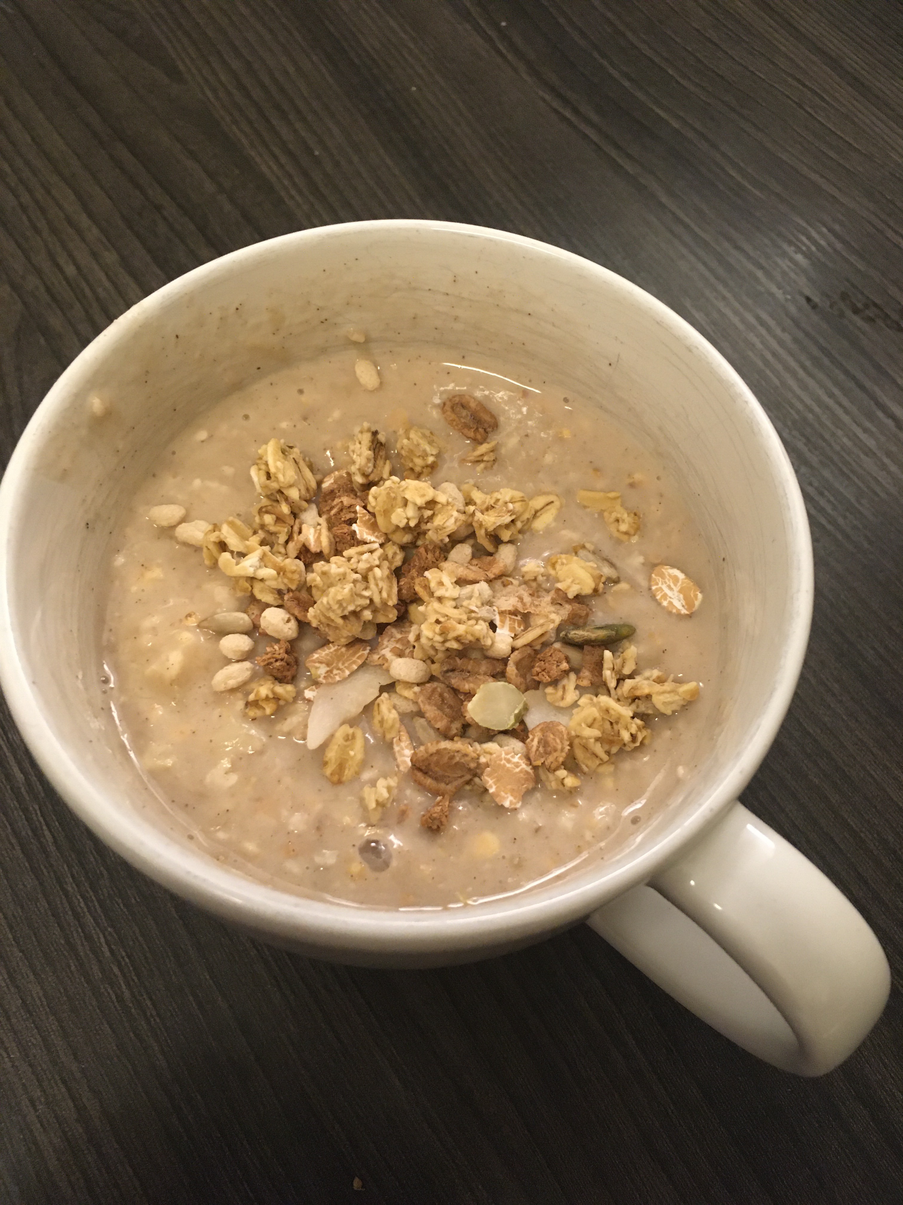 I had the staff mash the bananas with a fork. Then we threw all ingredients in a saucepan and brought it to a boil. Then turned the heat down and had it cook for a few minutes. I stirred constantly, so that the oats wouldn’t get crusty. After we removed the oatmeal from the stove, we added granola as a topping. That wasn’t in the recipe I used, but I thought I’d like it and we had lots of granola left over anyway.
